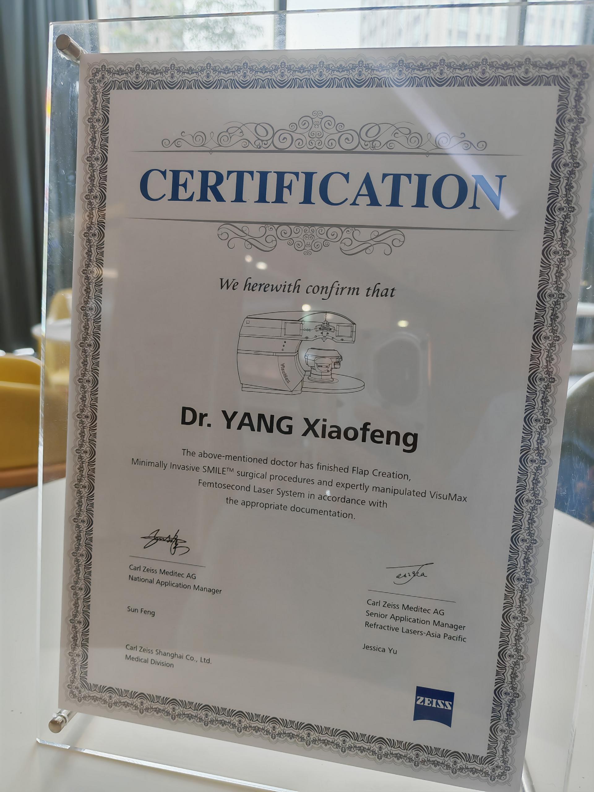 在专业认证层面,杨晓锋博士是精雕 C+ Contoura vision 认证医师、Smile 手术全球认证医师,这些权威认证不仅是技术能力的背书,更代表其在屈光手术领域的专业深度与行业认可度。